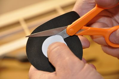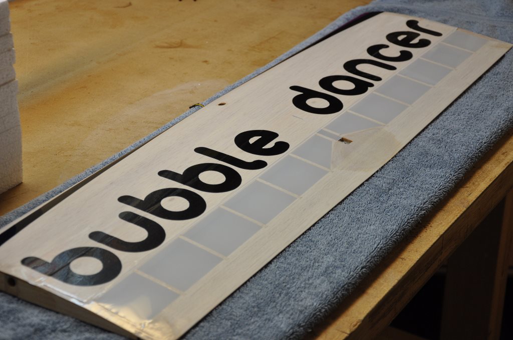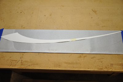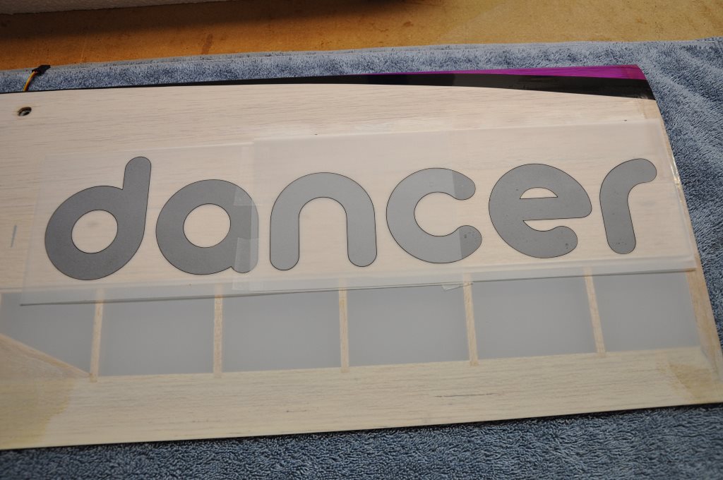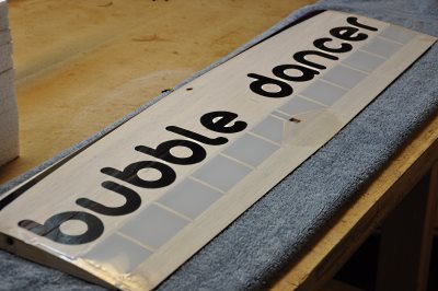 I used a French Curve to trace out my "swoosh" pattern onto the stabilizer plans. Then I cut the swooshes from the pearl black covering.