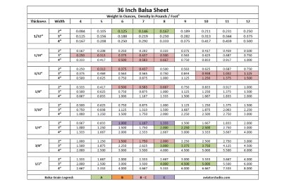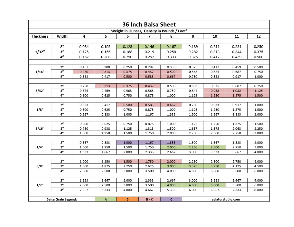 Usually most balsa charts are listed in 2 pound increments - this one is expanded to show 1 pound increments. It also features color coding to the grains and weights specifically needed for the Bubble Dancer.