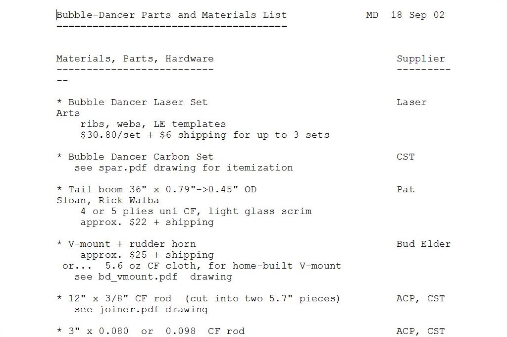 The Bubble Dancer Balsa Weight Chart created specifically for selecting balsa for the Bubble Dancer.