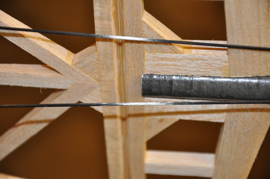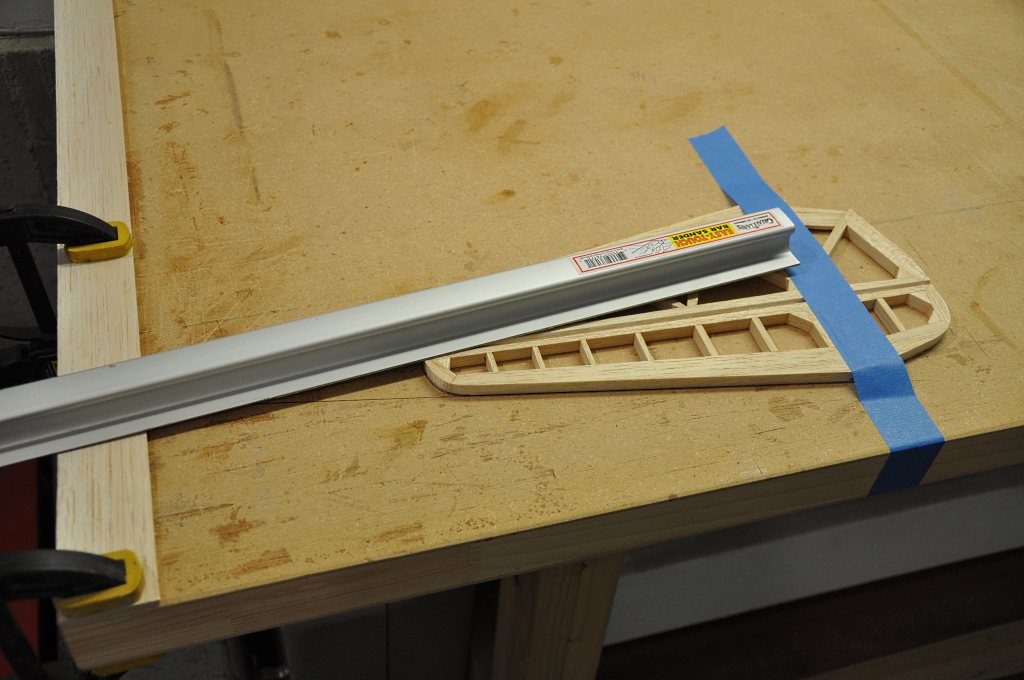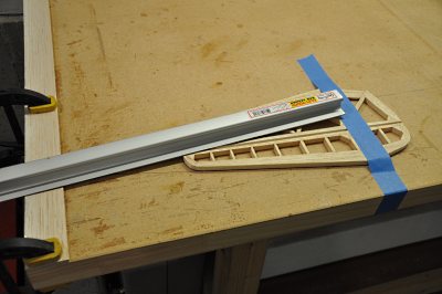 I then place 1/8" scraps of balsa under the trailing edge to lift it to the middle of the rudder ribs.