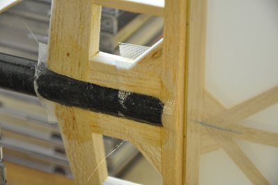 At any rate, using thickened epoxy on the curved slot, mount the fin to the boom. Obviously be ready to properly align the fin while it cures.