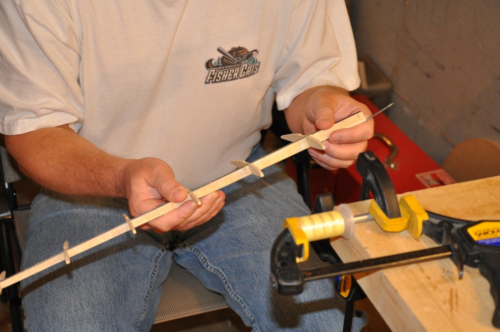 The next step was wrapping the spars with Kevlar. You can see that I secured my Kevlar thread spool on my X-Acto handle (blade removed) via two clamps.