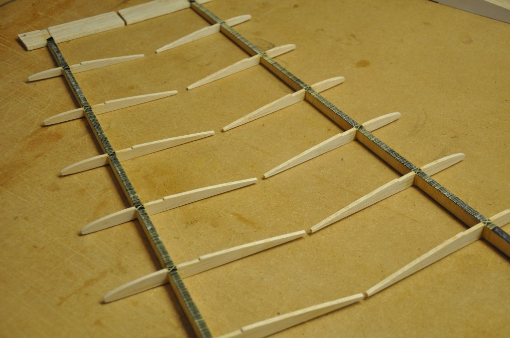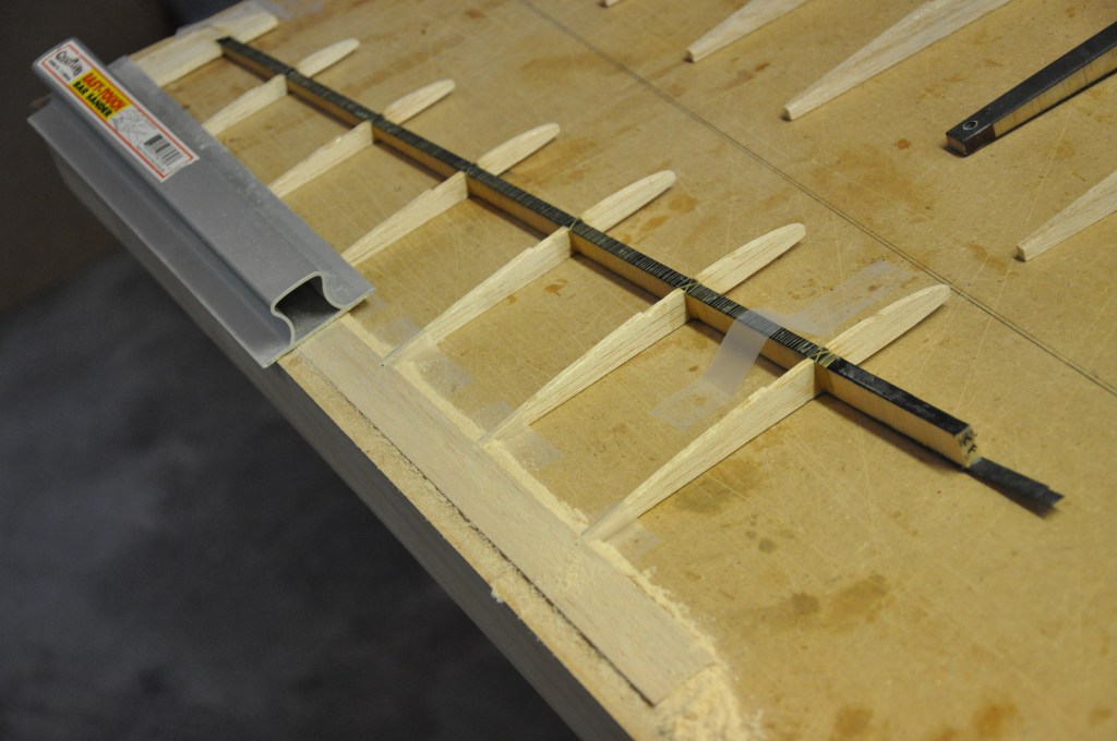 The carbon spar caps sit ever so slightly lower than the rib contours. Because of this, balsa spar cap strips need to be glued to the spar caps. Once in place I carefully sanded the balsa spar caps to the contour of the ribs so that the sheeting that follows would fit perfectly to rib and spar.
