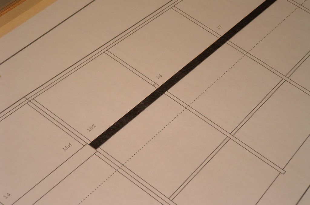 Rather than tape the plans right up to the edge of the workbench, I left myself a few inches at the close side of the table to allow an open work area for any long pieces.