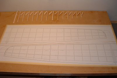 To facilitate building the wing, I sliced up my wing plans to just the mid and tip part of each wing. Additionally I cut them so that they could be placed side by side for easier comparison as I went along.
