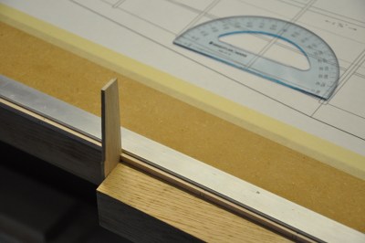I measured the joint angle (see protractor) and sanded that angle into an oak board. Then I used double-sided tape to secure that board to the front edge of my workbench. I attached a metal bar to the trailing edge stock to be a depth stop and then proceeded to sand in the notches.