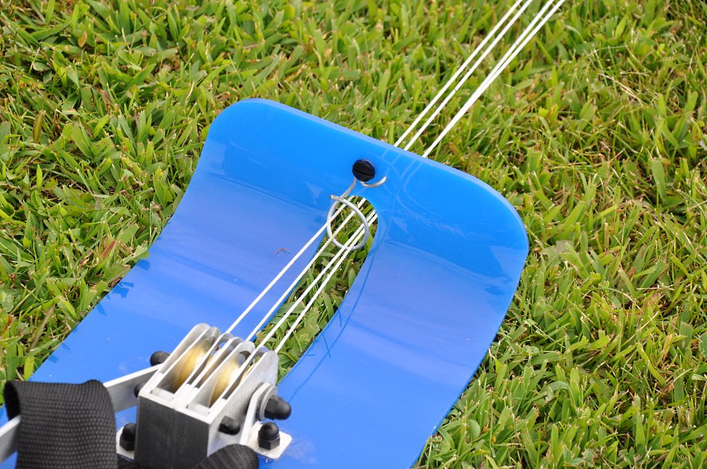 To self-launch, clip the sled's belt around your waist. Make sure that the curved part of the sled is pointing up, and that all the lines exit the sled at a right angle.