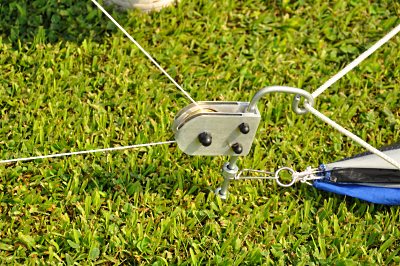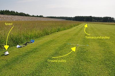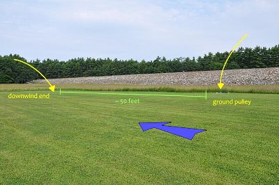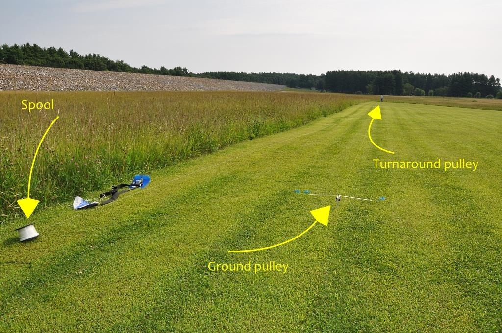 Edit: In these pictures, I have the reel next to the ground pulley, but it will actually work better to have it behind the ground pulley in the "walk back" zone. That way, once the line is completely unwound, you will have enough line left over to thread through the sled and ground pulley. - I'll try to update these pictures to reflect this...
