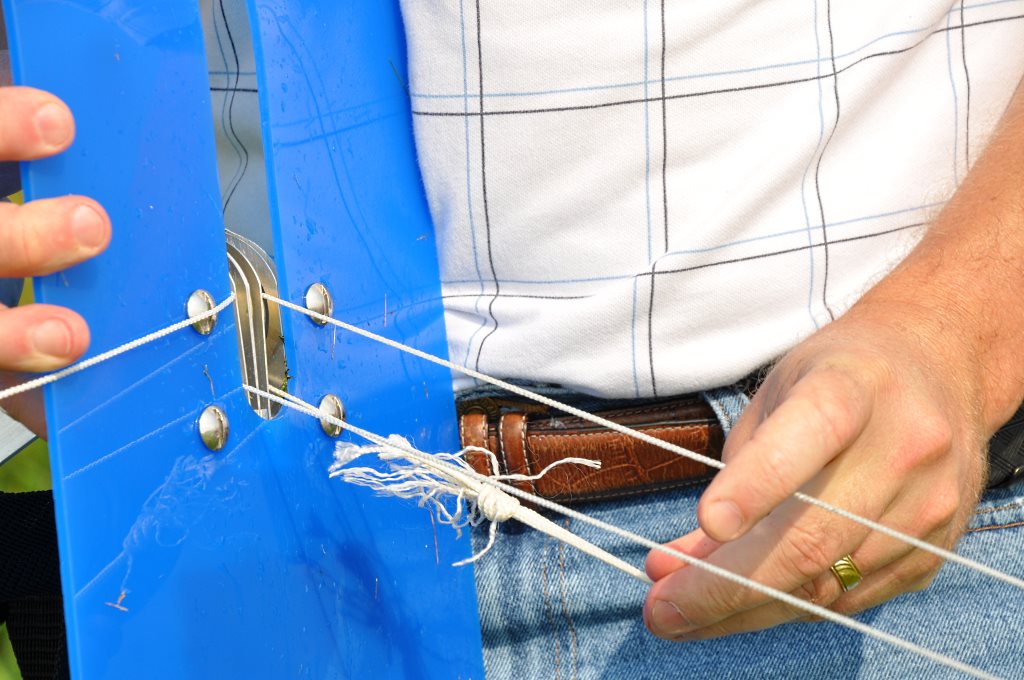 Run the lines through the pig-tail wire at the front of the sled and gently pull the lines straight.