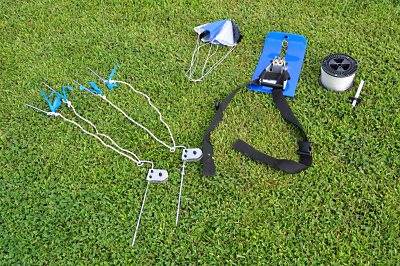 Attatch the line to the parachute and then hook the parachute ring to the clip on the Ground Pulley.